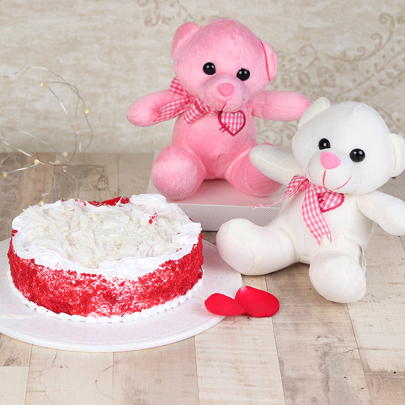 - No words can justify the adorability of this combo– Pink and white twin teddy bears accompanied by a red-velvet cake adorned with twin love hearts. This combo is all about double love, joy, sweetness and will surely double up merriness of the moment.